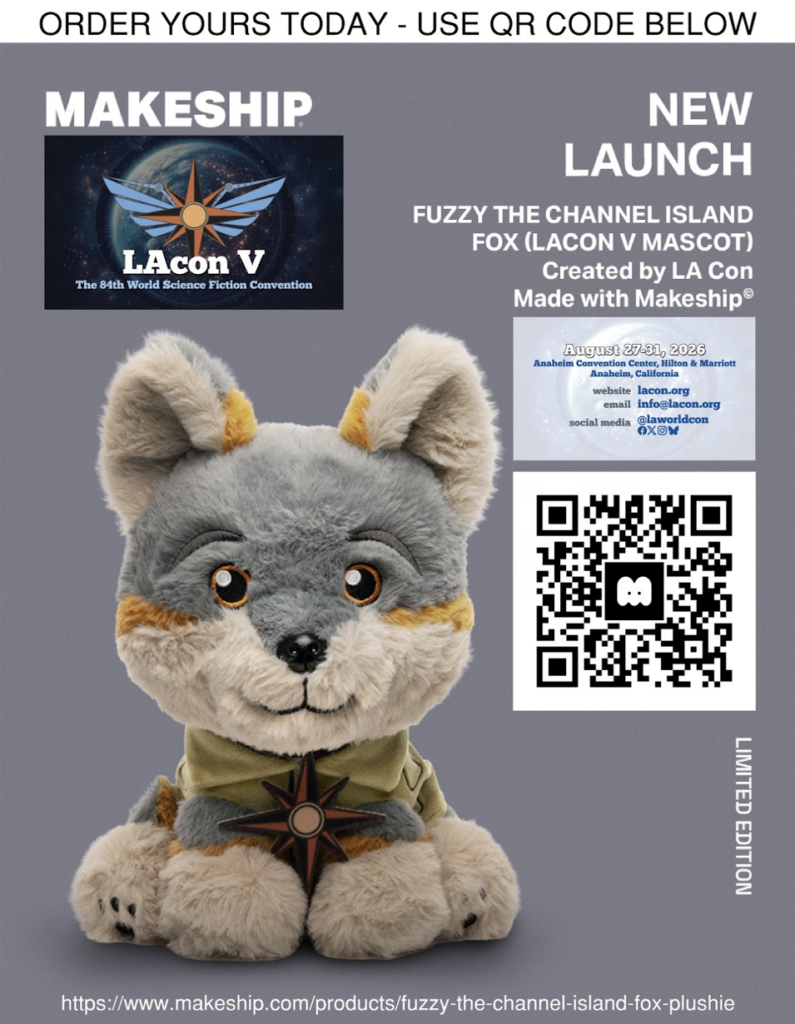 Fuzzy the Channel Island Fox is the mascot of LAcon V, the 84th World Science Fiction Convention. Named after Marilyn “Fuzzy Pink” Niven (1940-2023), a long-time fixture of science fiction conventions who was known for her efforts to welcome new fans to the community, this plush Fuzzy The Fox will be a memento of LAcon V that will be a treasured keepsake and a tribute to a well loved science fiction fan.